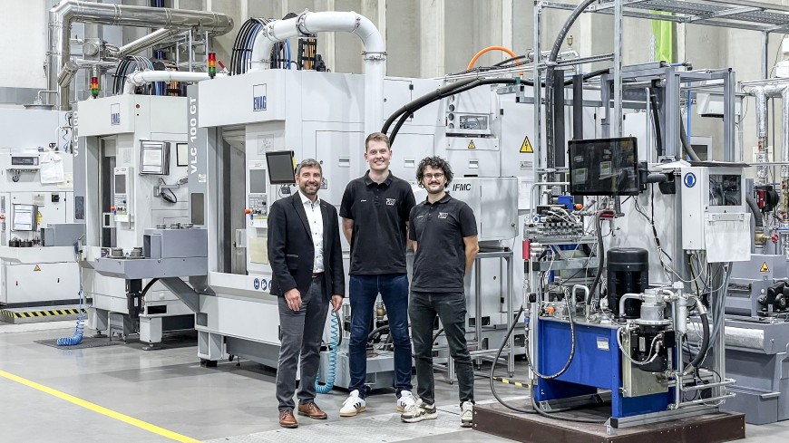 Das ENIPRO Projektteam in der ETA-Fabrik am Standort Lichtwiese. (v. l. n. r.) Prof. Matthias Weigold, Jerome Stock, Andreas Clement.