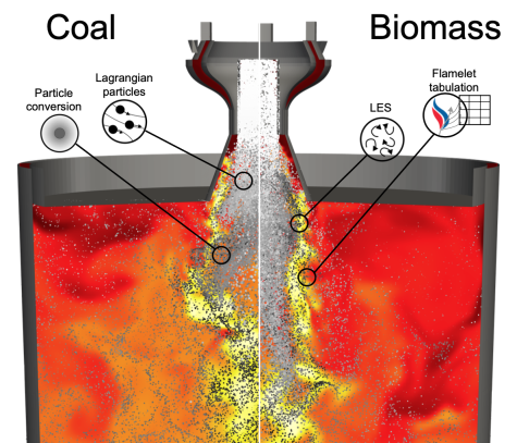 Solid Fuel combustion: flamelet modeling, large eddy simulation of biomass combustion, Lagrange particles