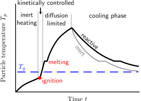 Typical temperature evolution of a single iron particle during combustion. Multiple successive phases of combustion exist, at which different physical and chemical processes control the reaction and heat release rate.
