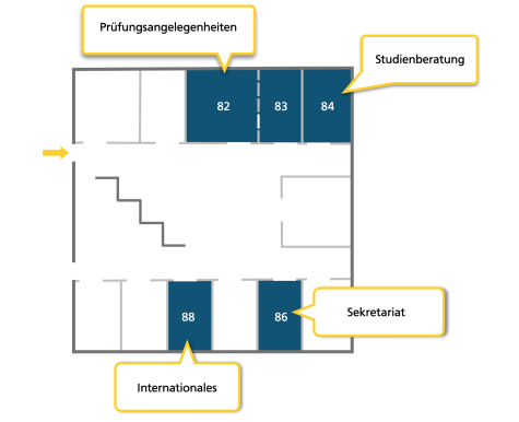 Alternativ kannst Du den Haupteingang benutzen – orientiert an dem roten Zahnrad (in der Graphik als blauer Eingang markiert). Von dort aus nutze den hinteren Weg durch das Gebäude, um zum MechCenter zu gelangen.
