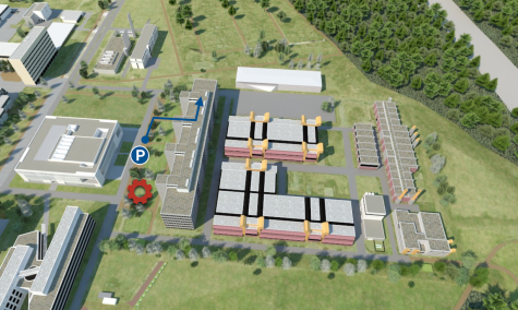 Alternatively, you can use the main entrance – orientated by the red cogwheel (marked as the blue entrance in the picture). From there, use the back path through the building to get to the MechCenter.